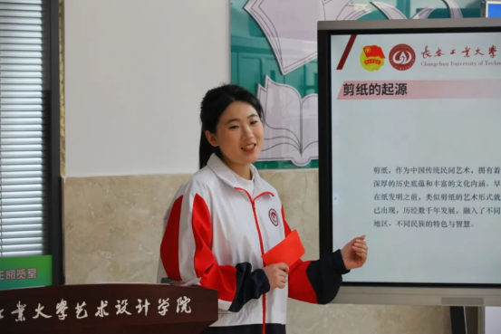 活动现场,学生讲师团以中国人民抗日战争暨世界反法西斯战争胜利80周年为背景,通过原创系列剪纸作品《烽火史诗》展开沉浸式讲解。飞夺泸定桥的壮烈场景、红船初心的历史定格、井冈星火的革命精神,在纤薄红纸与镂空光影中焕发新时代感染力。配合《青春中国》主题诗朗诵的磅礴声韵,非遗技艺与红色叙事交相辉映,构建起可触可感的“行走的思政课堂”。